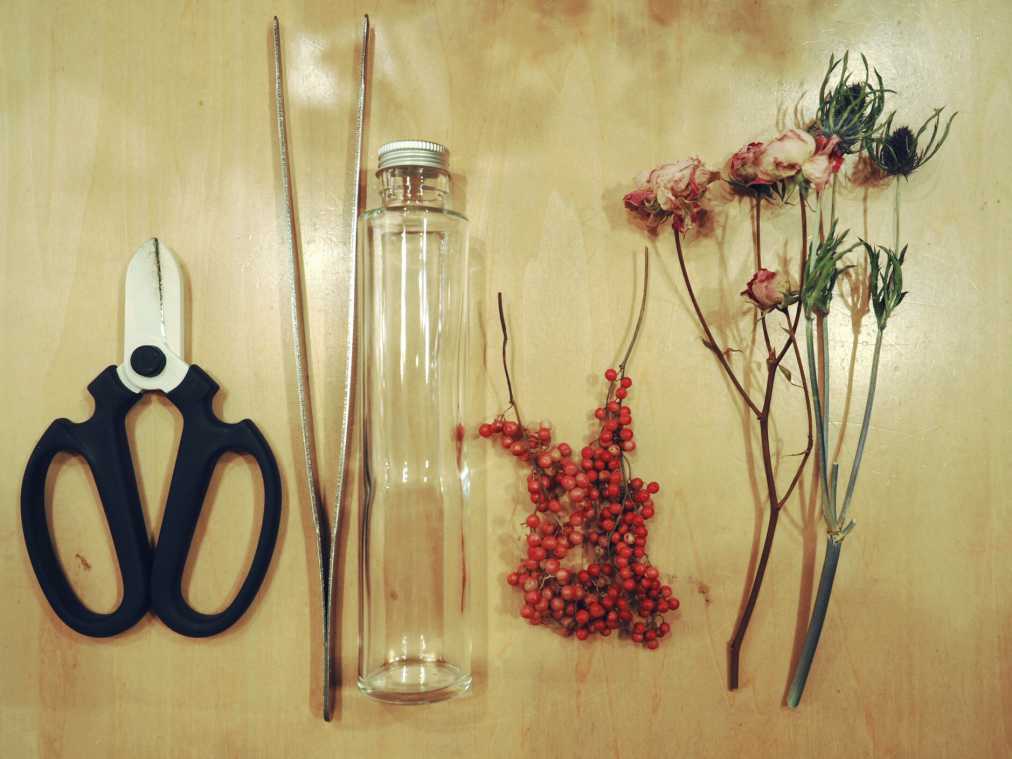 それでは、早速作っていきましょう。使う道具はピンセットとハサミのみ。あとはお気に入りの花をじっくり選びます。