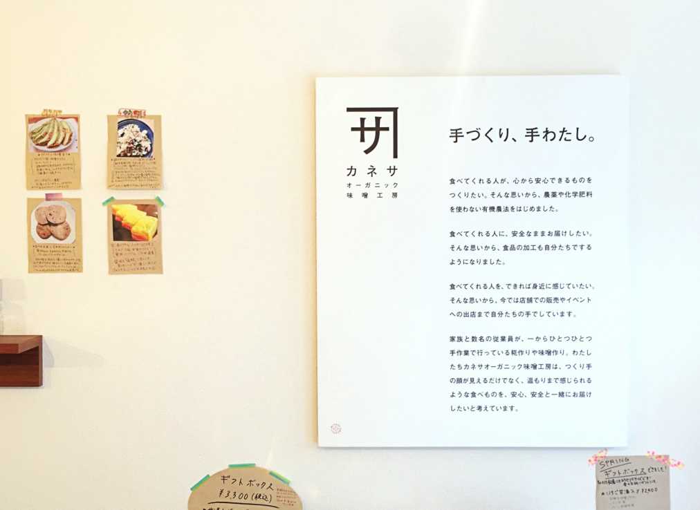 店内に大きく飾られているのは、手作りと手渡しの想い。“心から安心して食べてもらいたい”という思いから安部さん一家が有機農法を始めて20年、販売し始めて5年が経つそうです。