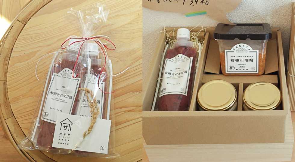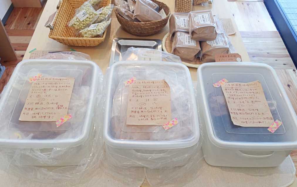 店内に入ると、まず目に入るのが、「カネサオーガニック味噌工房」自慢の「有機生味噌」(810円/400g、1250円/650g)。試食してみると、しっかりと感じる大豆の味、麹の優しい甘みとコクが口の中に広がります。そしてこれまでに食べた味噌とはなんだか違うフレッシュでマイルドな味わい。