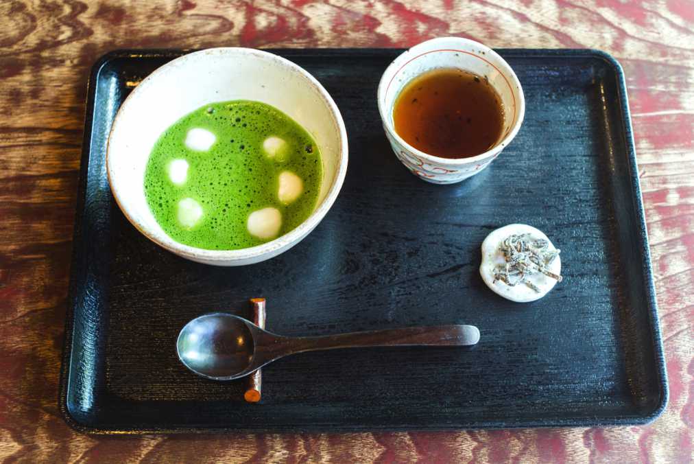 新緑のように美しいグリーンが目をひく抹茶ぜんざいには、京都の宇治抹茶を使用。オーナー自らこだわりをもって吟味しているというだけあって、濃厚なのに甘過ぎない味わいです。