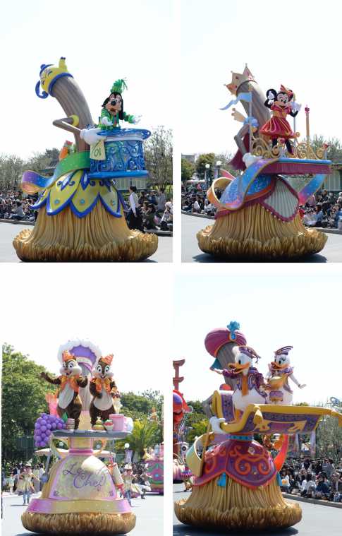 グーフィー、ミニー、チップ&デール、ドナルド&デイジーは魔法のほうきのフロートで登場。それぞれ異なるデザインの魔法のほうきに注目です。
