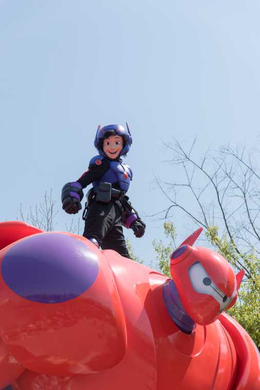 『ベイマックス』のヒロはパレード初登場。「ベイマックス2.0」にアップグレードした空飛ぶベイマックスに乗ってやってきます。映画のワンシーンのようです。