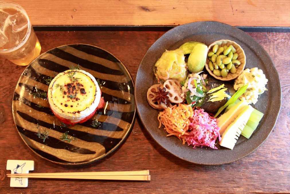 毎日新鮮な野菜を中心に素材を調理して、大皿に盛り付けて提供するスタイル。スタッフが全員女性ということもあって、女性1人で来店する方も多いそう。気さくなハルノさんを中心に話の輪が広がり、お客さん同士が仲よくなることもしばしば。居心地のよさを感じますね。