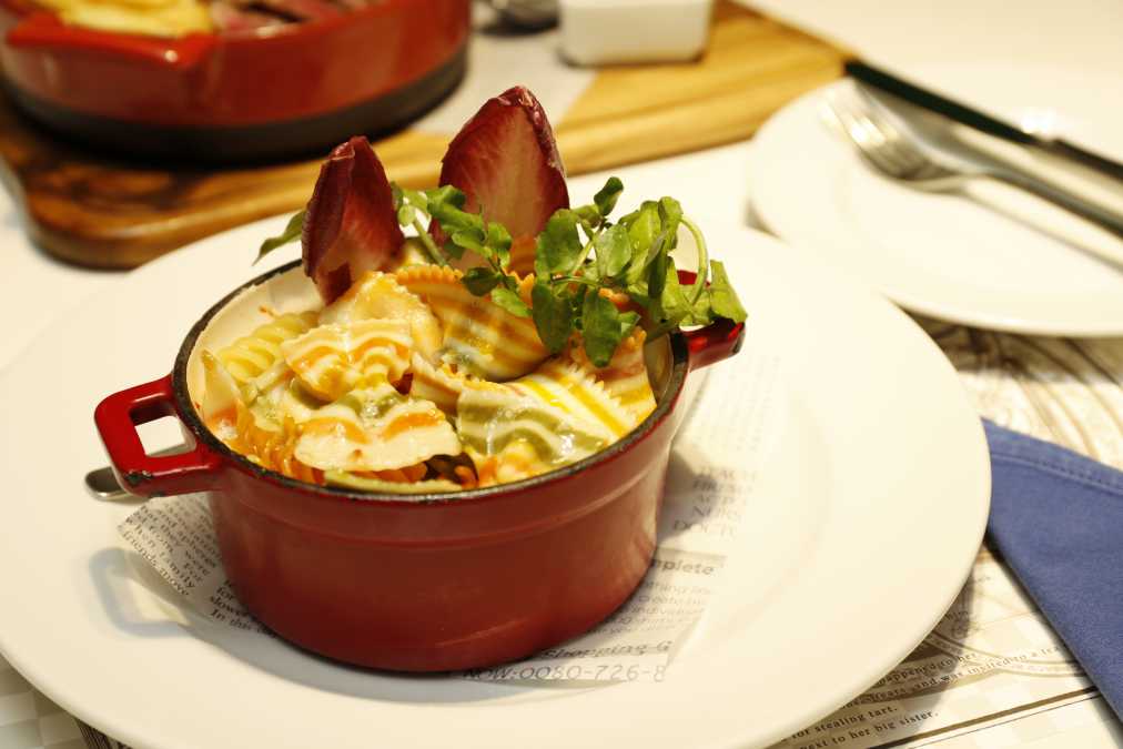 こちらは時計ウサギをモチーフにしたディナーメニューの「カラフルパステルパスタ~温野菜とトマト&チーズ~」(1296円)。もちもちのパスタは濃厚なチーズとの相性も抜群!パスタの下には、トマトソースで味付けられたホクホクのジャガイモが敷かれています。飾りであしらわれたレッドアンディーブはウサギの耳を表していますよ。