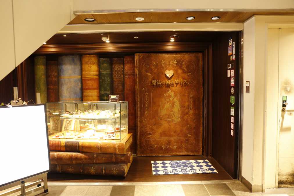 「魔法の国のアリス」へは新宿駅中央西口から徒歩1分で到着。入口には大きな本が並んでいて、入店前からワクワクさせてくれます。この扉の向こうに広がるアリスの世界観にドキドキワクワク!