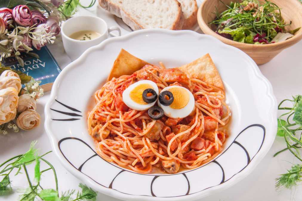 「魔法の国のアリス」のメニューも見逃せません。写真の「チェシャ猫のニヤニヤスマイルチキンとトマトのスパゲティセット」(1280円)は、その名の通り微笑むチェシャ猫の表情がキュートなトマトソースのスパゲティ。スープ、パン、サラダが付く大満足なランチメニューです。