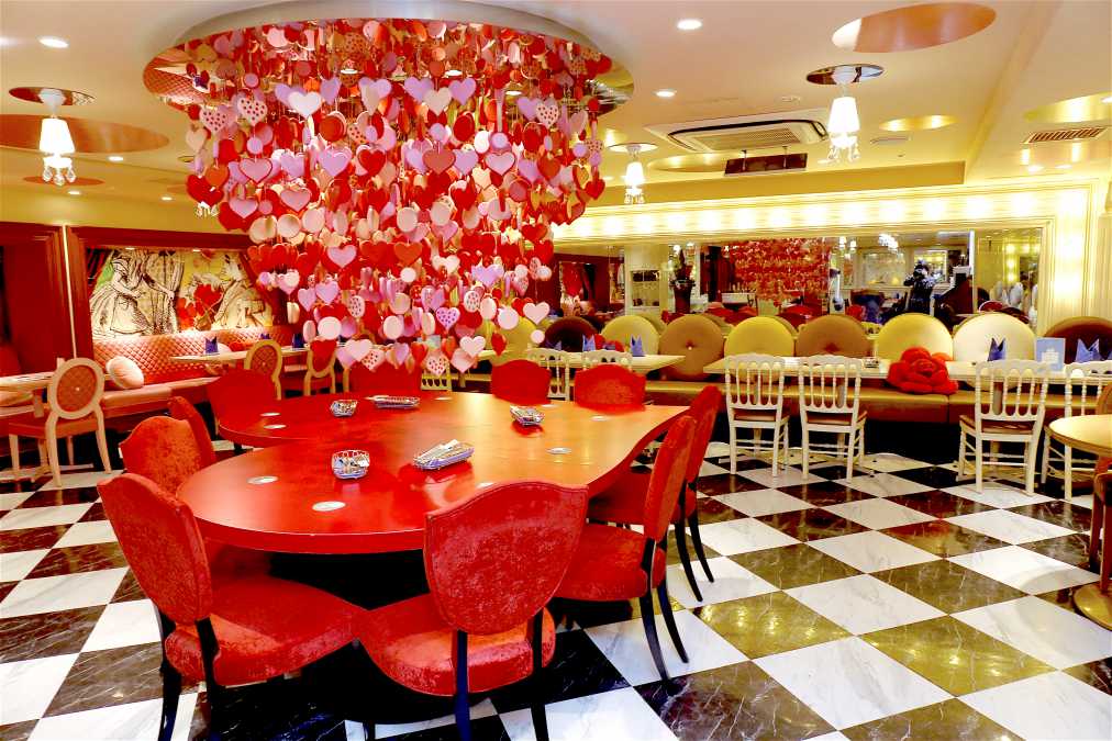 「魔法の国のアリス」のテーマは“女王様のお庭”。席ごとにデザインが違うので、どの席に案内されるかは来店してからのお楽しみ。写真の席はハートがぶら下がったシャンデリアに、ハートの大きなテーブルがインパクト大な女王様ご自慢の席!