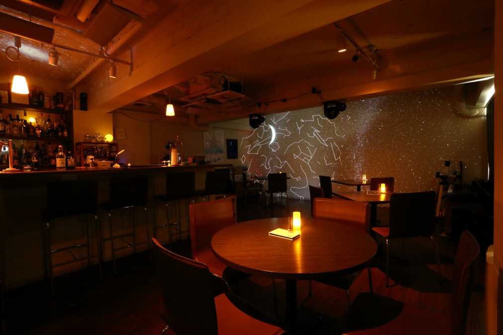 薄暗い店内は、天井から足元まで、全体がプラネタリウムになっています。奥の壁一面には、その日の20時頃の空が投影されています。