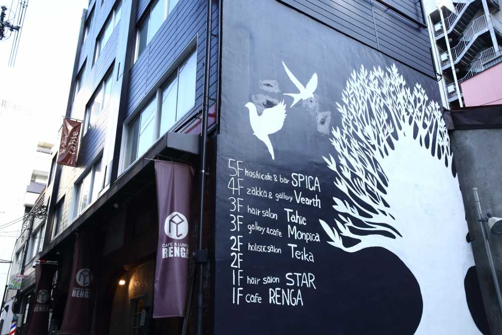 壁面に鳥と木のイラストが描かれたビルの最上階がお店です。