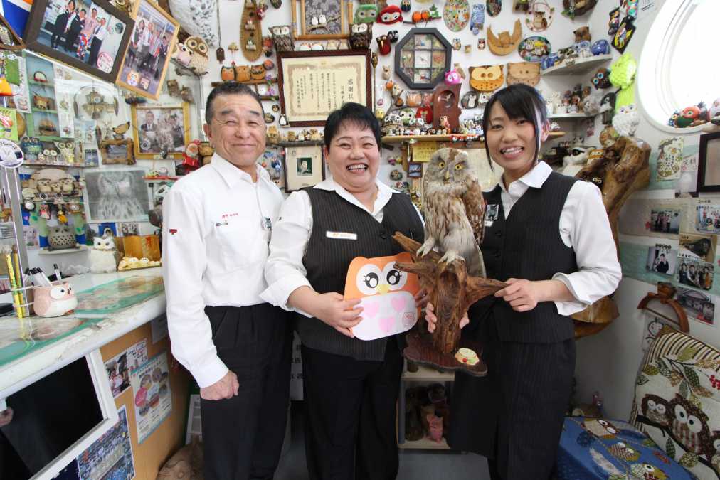 満面の笑顔と明るい声で出迎えてくれる、石橋彰彦さん、奥様であり局長を務める由紀子さん、娘の久美子さん。ご家族の優しい雰囲気とかわいいフクロウ達で、心地よい空気が流れます。