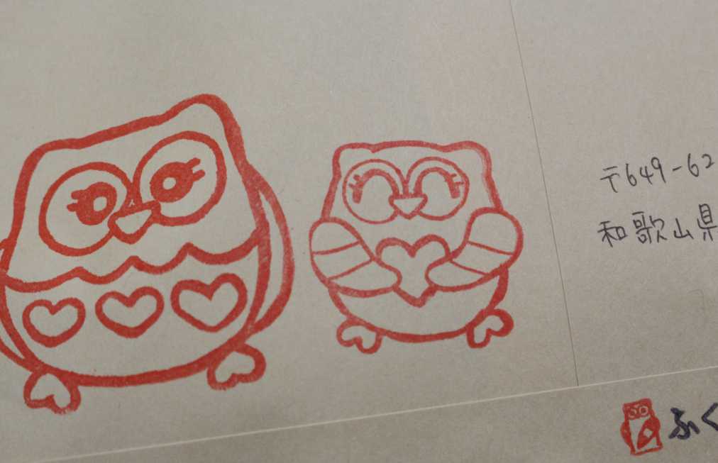 窓口に郵送物を持ち込むと、久美子さんお手製のフクロウハンコを押してくれます。