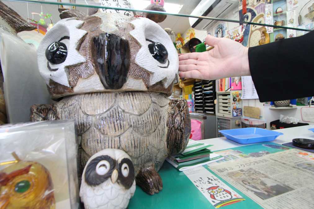窓口に置かれているインパクト大のフクロウ像。とある陶芸家が独自に作陶し、寄贈してくれたもので、ふれると良いことが訪れると超人気者です。