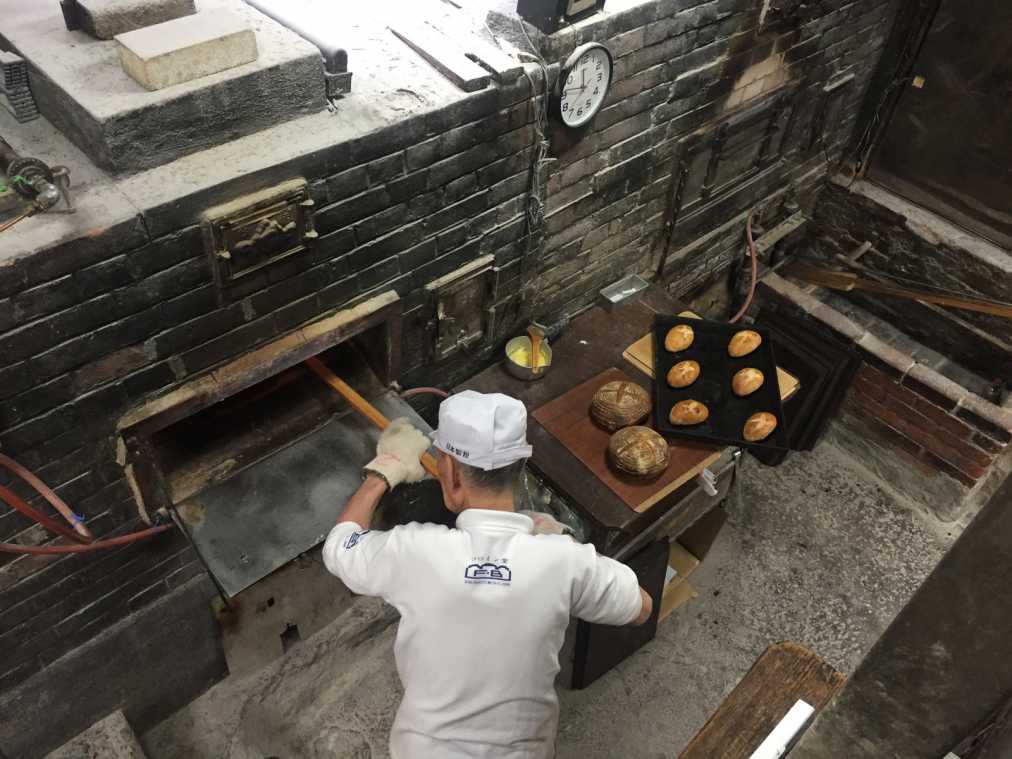 捏ねあがった生地は、大きな作業台で分割し、丸めて食パンの型に入れていきます。その後、発酵して膨らんだ生地をドイツ式のレンガ窯へ。「この窯は強運なんですよ。戦争も阪神淡路大震災でも壊れなかったんです」と竹内さん。