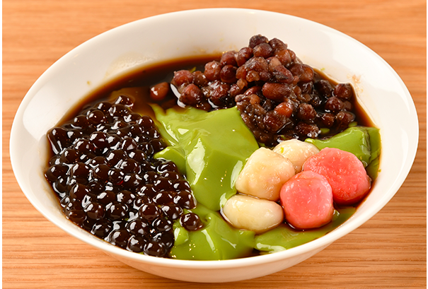 タピオカや甘さ控えめの小豆などをトッピングした『I LOVE 豆花(アイ ラブ トウファ)』の「抹茶豆花コンボ」500円。満足できる食べ応えにもかかわらず、ローカロリーでヘルシーなのがうれしい!