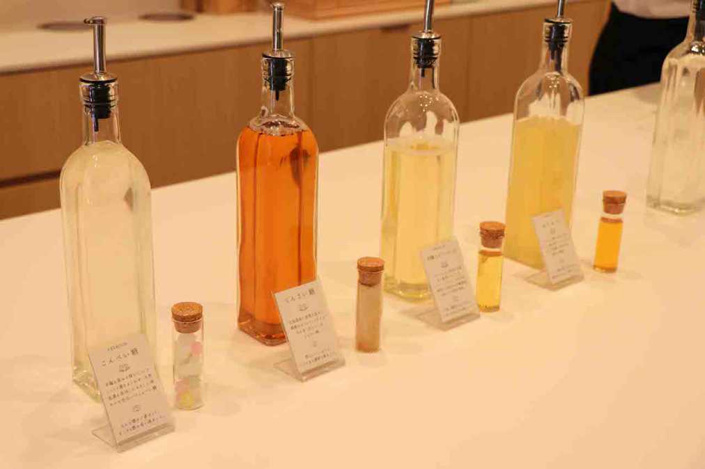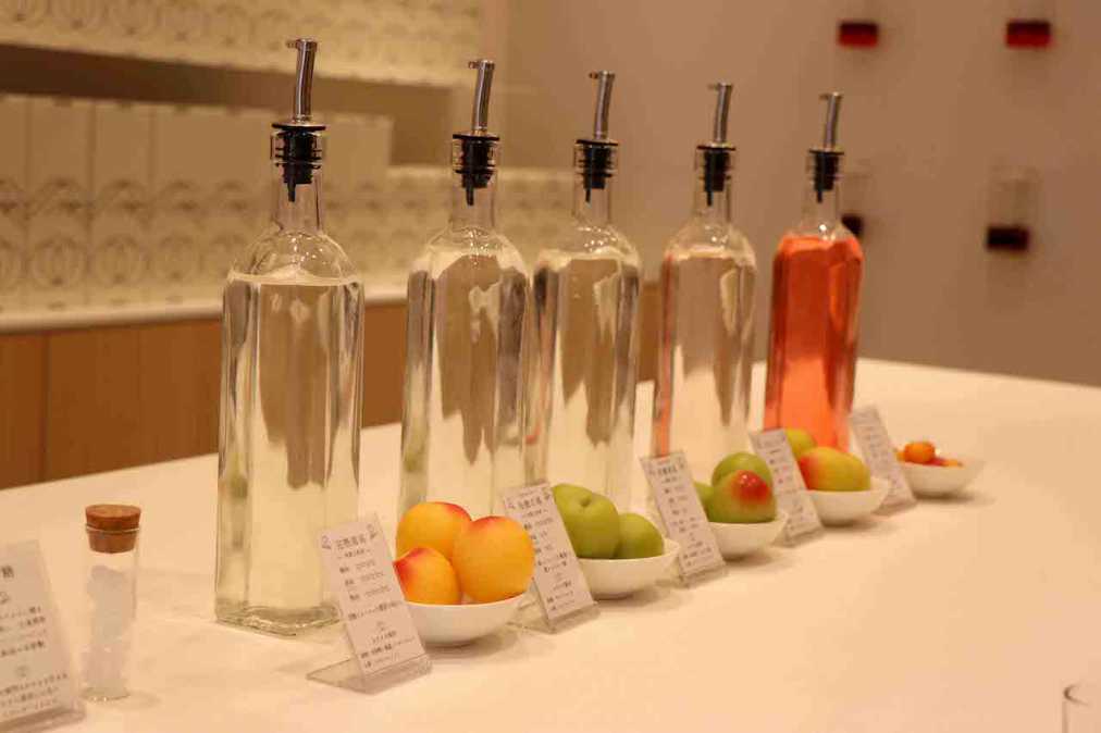 有機南高梅、有機古城梅などをはじめ、梅の種類は5種類。それぞれ氷砂糖でひきだした梅エキスのシロップを試飲して、好みの梅の味を探します。