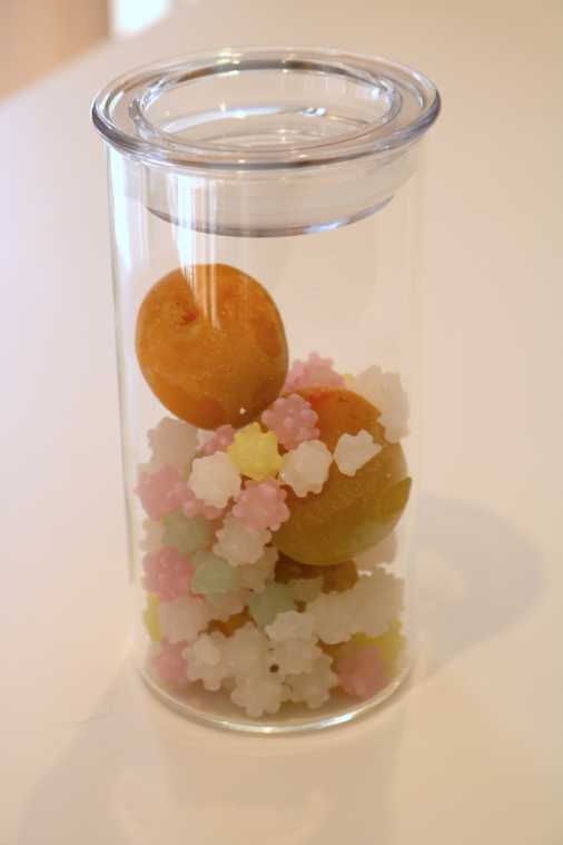 梅、こんぺい糖、梅、こんぺい糖と重ねていきます。これで仕込みは完了!あとは1日1回、くるくるとガラス瓶を回して梅と糖をなじませます。