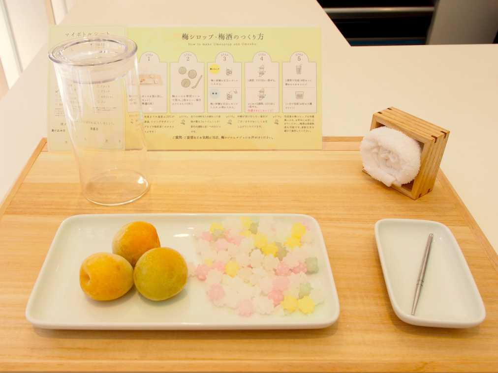 完熟南高梅とかわいらしいこんぺい糖の組み合わせをチョイス!横に添えられた器具で大粒の梅のヘタをとります。こんぺい糖は人気No.1。見た目のかわいさが人気なのはもちろん、こんぺい糖は糖を重ねてつくられているので、梅シロップに香ばしいような奥深い味わいがでるそう。