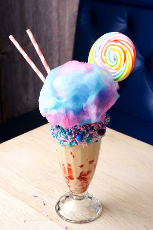 なかでも特にインスタ映え抜群なのが「THE CANDY SHOPPE(ザ キャンディーショップ)」(1480円)。ストロベリーベースのシェイクにユニコーンカラーのわたあめと、レインボーカラーのキャンディーがとにかくド派手!見た目に反してゴクゴク飲めるおいしさです。