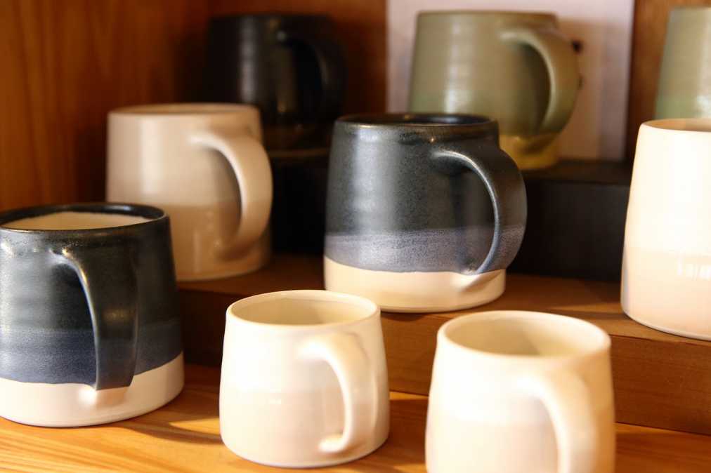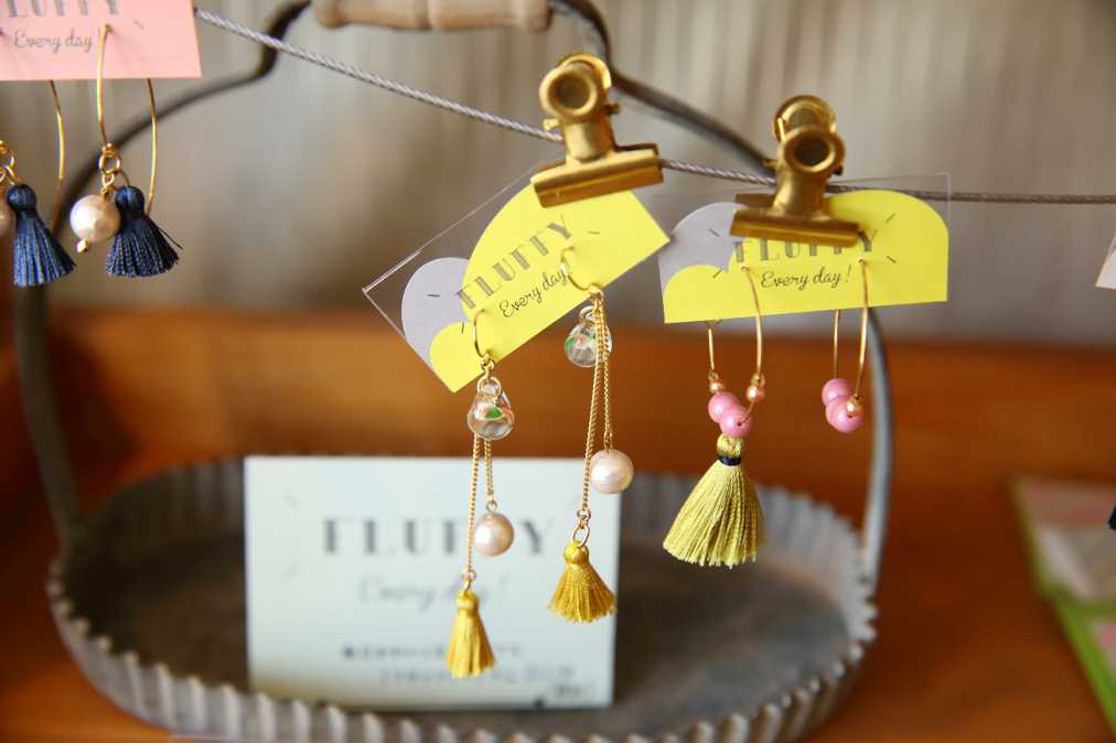 手作りの棚には、オーナーやスタッフのみなさんが国内外から買い付けてきた食器や、オリジナルブランド「FLUFFY(フラッフィー)」の手作りアクセサリーが並びます。インテリアの一部のようですが、すべて購入可能です!