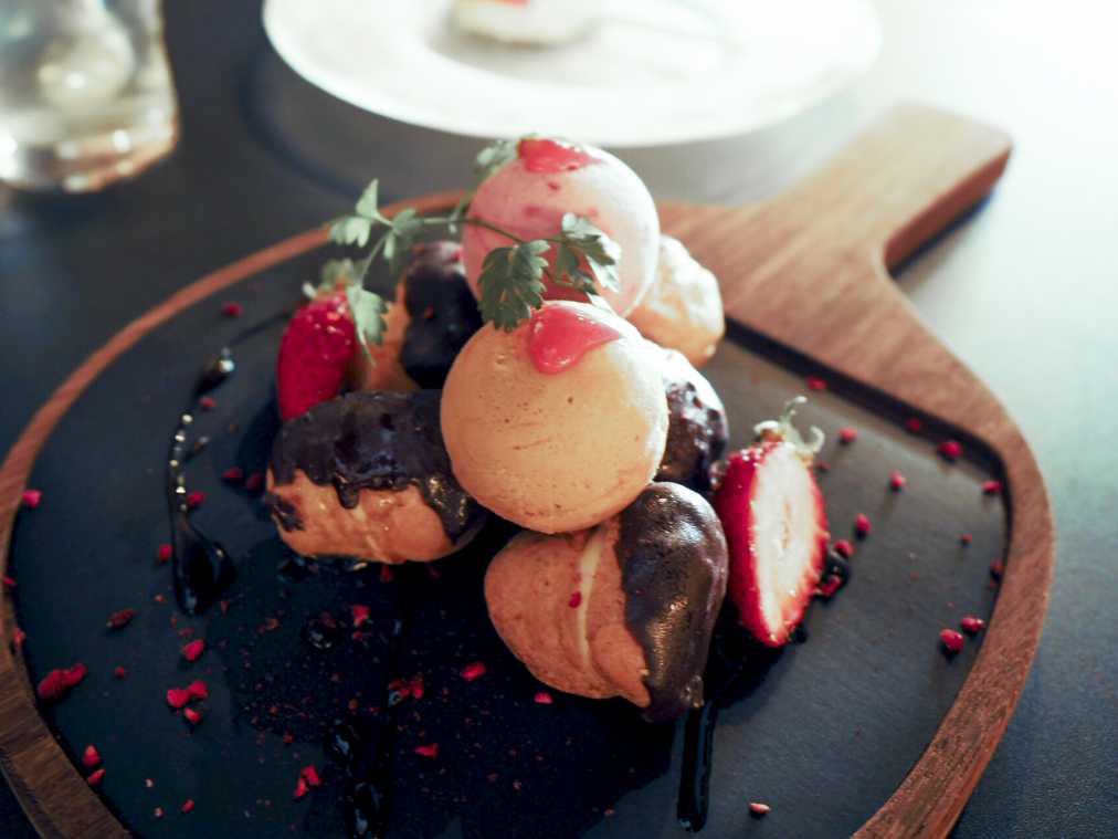 こちらは「ピンポンプロフィットロール」(756円)。ラケット型のお皿の上に、ピンポン球を模したシュークリームとフランボワーズのパルフェがのっています。ボリュームがあるので、皆でシェアして楽しめますよ!