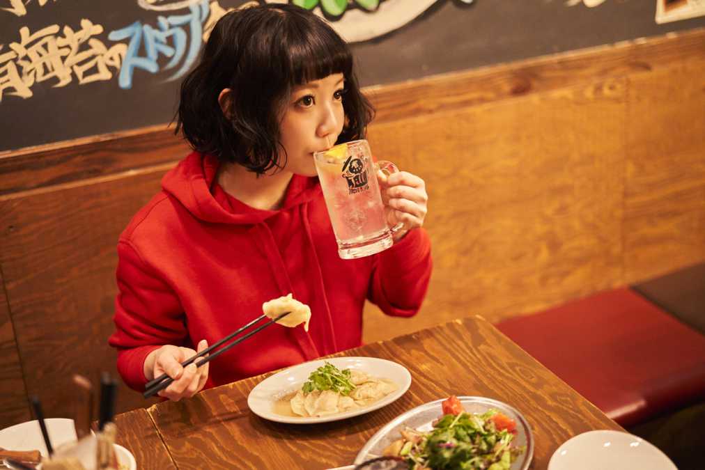 何やらジョッキを構える私。どーーーしても気になった「海老とクレソンのビストロギョウザ(840円)」をシメの一品として注文、それに合わせて生レモンサワーをちゃっかり。