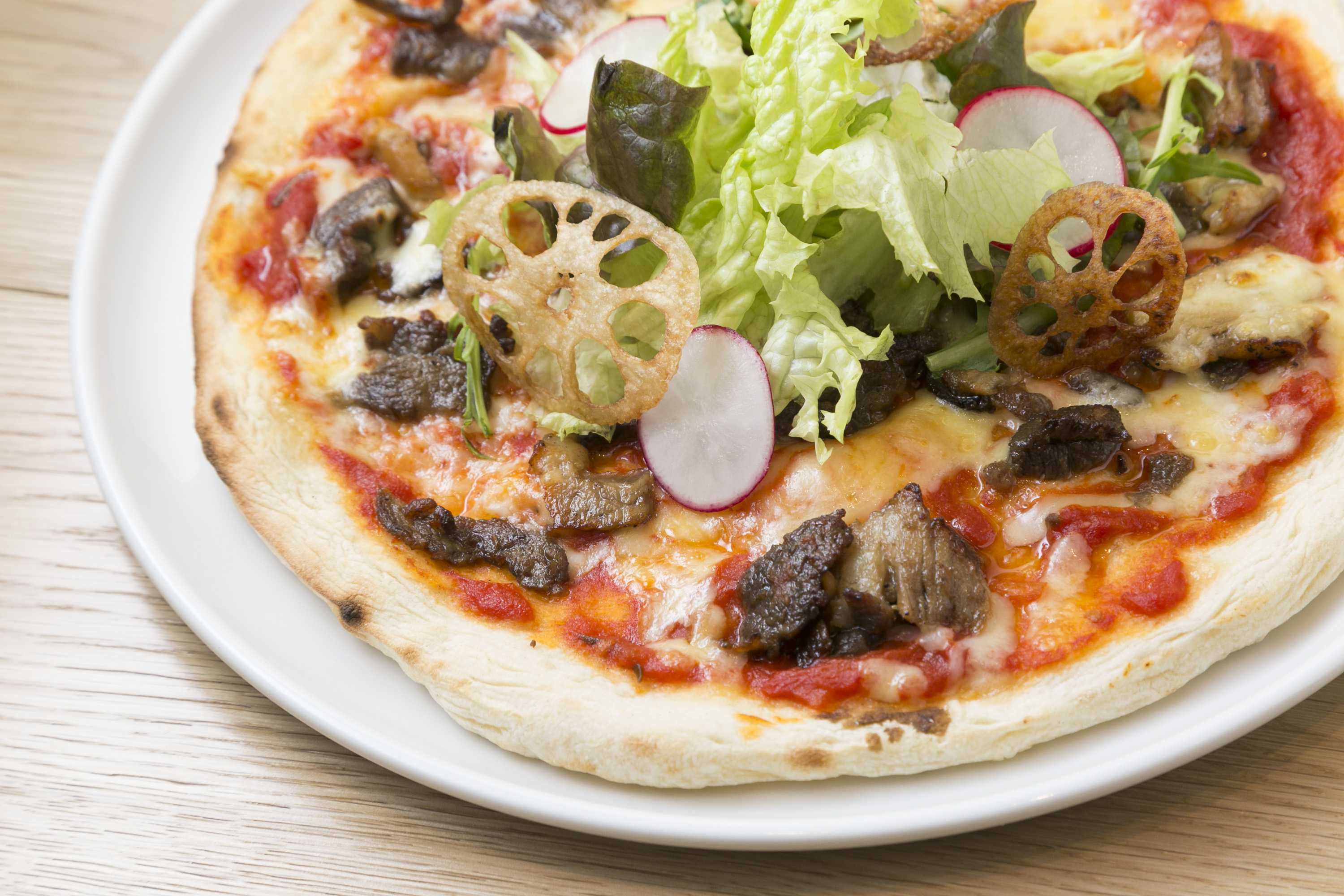 目の前に焼きたてのピザがリリースされると、まず目に飛び込んでくるのは、野菜のみずみずしさ。写真は季節の野菜ときのこの米粉入りピザ1188円。朝どれのレタスやラディッシュのシャキシャキ感、そして肉厚キノコのプリプリ感が食欲を誘います。