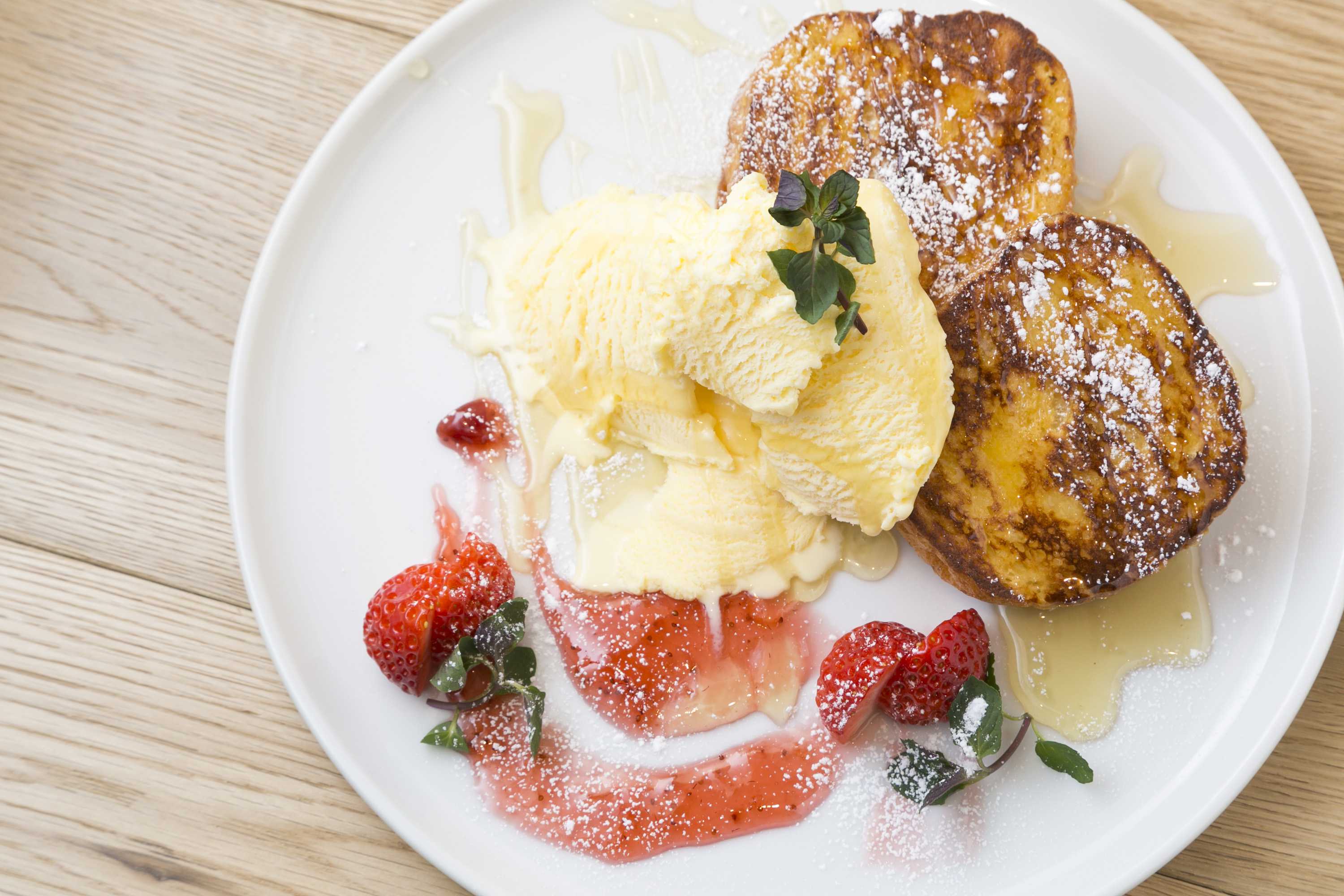 食後にも、米粉を生かした極上スイーツが待っています。米粉入りパンのフレンチハニートースト961円は、もっちり食感のパン、県産ブランドイチゴ「越後姫」のフレッシュ感、そしてバニラアイスの口どけがハーモニーを生み、極上の口福感!