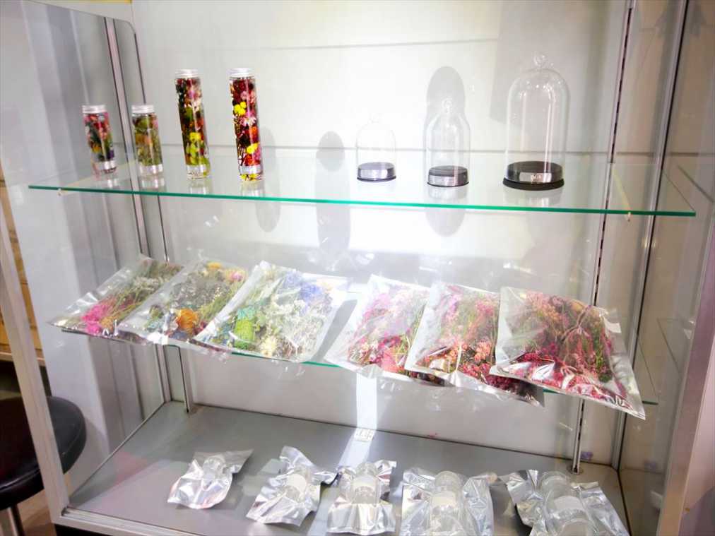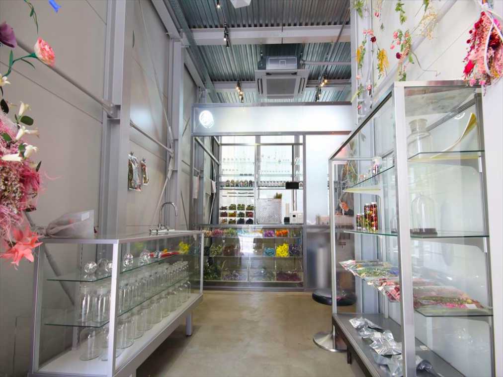 西洋では古来、調剤薬局が薬草を乾燥させて薬として処方していたことにヒントを得て、調剤薬局をコンセプトにしたのだとか。ここでは、ドライフラワーを“心を癒してくれる薬”として扱っています。