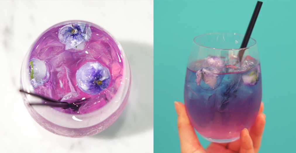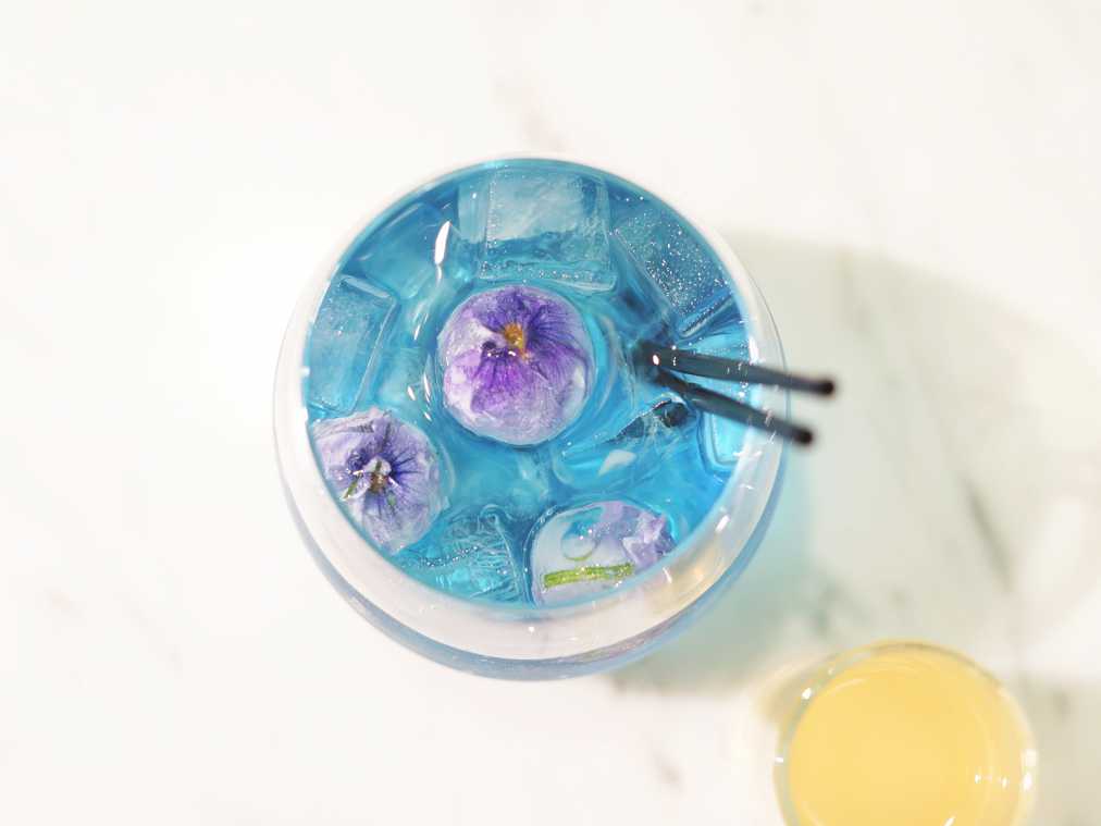 ブルーレモネードはホットも人気。エディブルフラワーと一緒に召し上がれ。