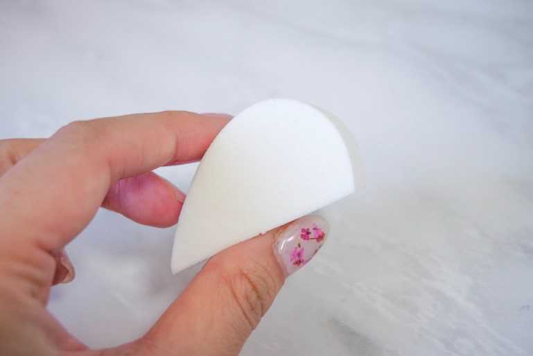 ファンデーションやコンシーラーなどを塗り終えたら、次にまた別のスポンジを使っていきます。今度はこのスポンジを水に含ませて絞ったもので肌をおさえます。
