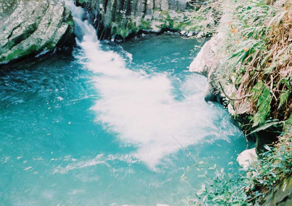 2つの川が一つになって出会う、出会滝。どこの滝も水が澄んでいて驚くほど綺麗なラムネのような澄んだ色でした。