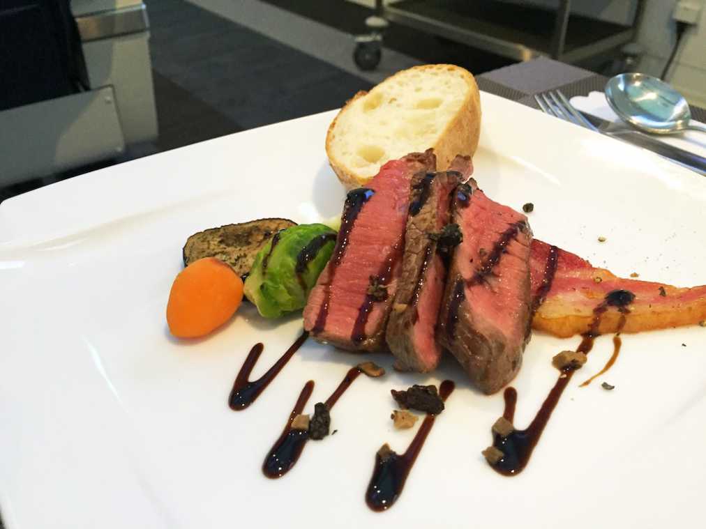 フライト中の楽しみといえば、やっぱり機内食。出てきたのは高級レストランのような豪華な食事!改めてエコノミーとの差をひしひしと感じます…。