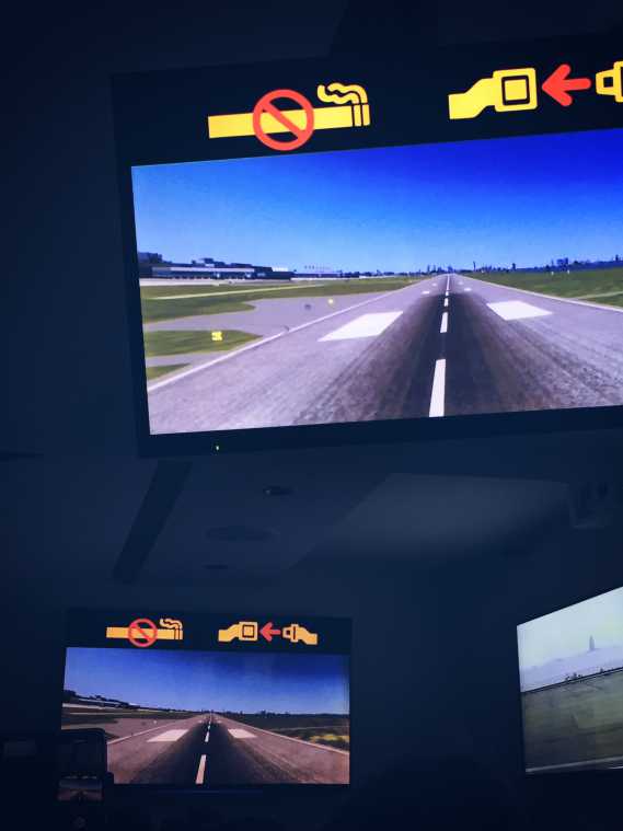 出発時間になると実際のフライトと同じように、シートベルトの着用や避難器具の説明があり離陸体制に入ります。離陸時に流れる「ポーン」というチャイムまでも本物同様。シートが振動し、ゴーッという離陸音も完全再現されています。スクリーンには離陸時の外の景色が流れるので、臨場感たっぷり!
