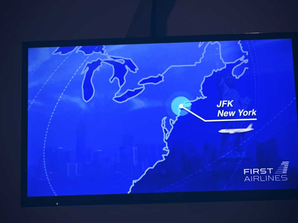 今回の目的地はニューヨーク!「FIRST AIRLINES(ファースト エアラインズ)」では、体験する日時によってハワイ・パリ・イタリア・フィンランド・タイムトラベル便があり、機内食も行き先ごとに異なります。