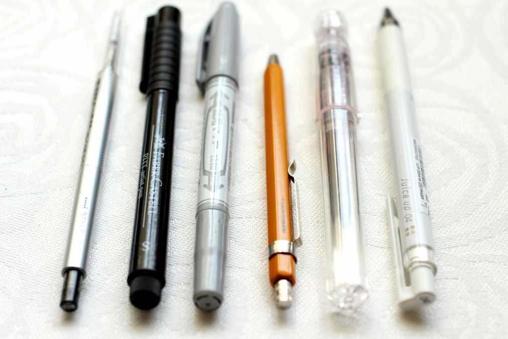 写真の左から順に、【細やかなコメント書きに適した「スタイルフィット(ブラック)」】、【見た目もスマートかつシンプルで使い勝手の良い「PITTアーティストペン(ブラックほか24色)」】、【色鉛筆の鮮やかさを強調できてやわらかな雰囲気がつくれる「紙用マッキー(グレー)」】、【自由な線が引ける下書き用「2ミリ芯ホルダー」】。