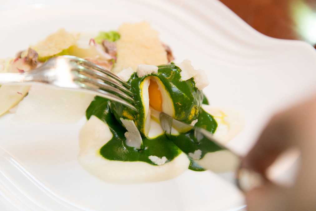前菜は「サラダ菜のピュレを纏ったポーチドエッグ チキンとアンチョビ、ホワイトアスパラガス シーザーサラダ風」。シーザーサラダの食材を使って、ホタルに見立てるというアイデアが楽しい一品です。