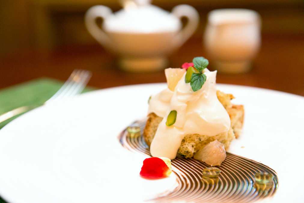 デザートはライムのジュレをホタルに見立てた「紅茶のシフォンケーキ ハチミツ風味のクリームチーズ ライムのジュレとともに」。