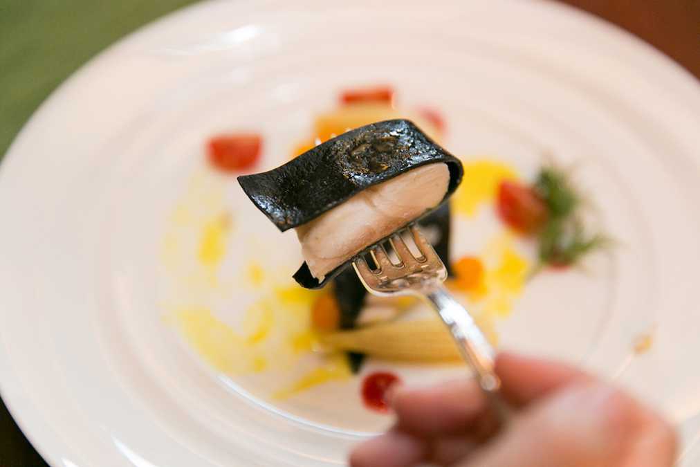 魚を包む黒いラヴィオリと鮮やかな2色のソースがインパクト大!ヴァプールとは、「蒸気」という意味で、フランスの蒸し料理の総称。ふっくらと蒸し上げられたスズキと、ラヴィオリの食感を楽しんで。