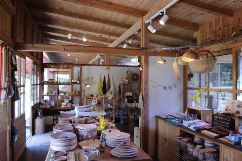 敷地内には時間を忘れて楽しめる雑貨店や家具ギャラリー、図書館も併設。雑貨店には無垢材で作ったオリジナルの雑貨がずらり。ぽってりとしたフォルムがかわいい木皿1550円~は、食卓をやさしく彩ります。
