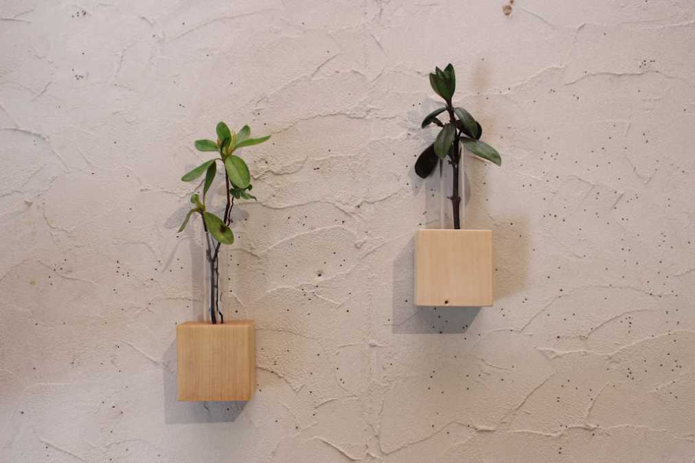 木のキューブと試験管を合わせた一輪挿し1080円〜は、どんなインテリアにも馴染む人気商品。美しい木目や木の香りを自宅でも楽しめます。