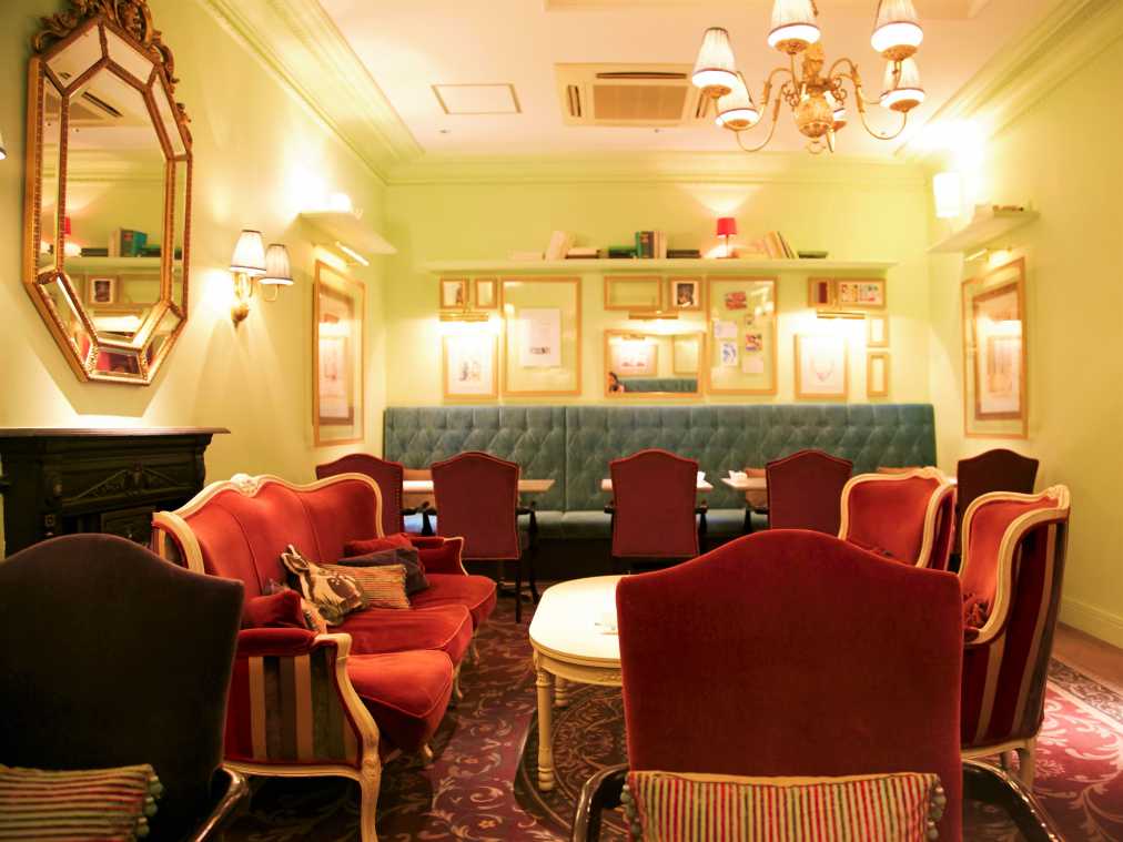 カフェスペースへと案内されて、まず驚くのが豪華なシャンデリアと深紅の壁のこの空間です。パリのオシャレ感を表現しているそうで、この絵もパリ在住の画家が描いたものなんだとか。