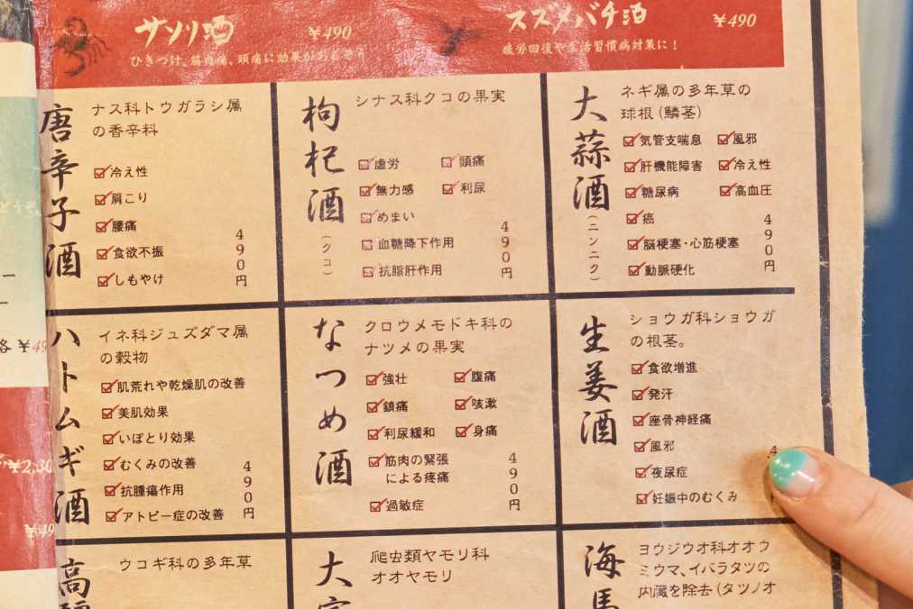 こちらのお店、料理だけでなくお酒も特徴的。自家製の薬膳酒がいろいろあって、漢方のように“何に効果的か“というのを読みながら選べるのです!