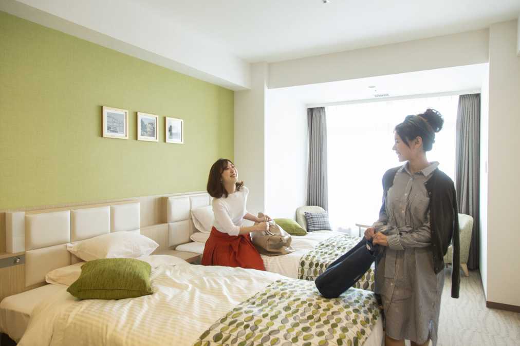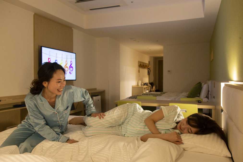 動画で盛り上がったあとは、音楽アプリのヒーリングミュージックをバックにクールダウン。ベッドでは旅のお約束、女子トークに花がさきます。家にいるようなくつろぎ空間でまったり過ごせば、いつの間にかウトウト…。