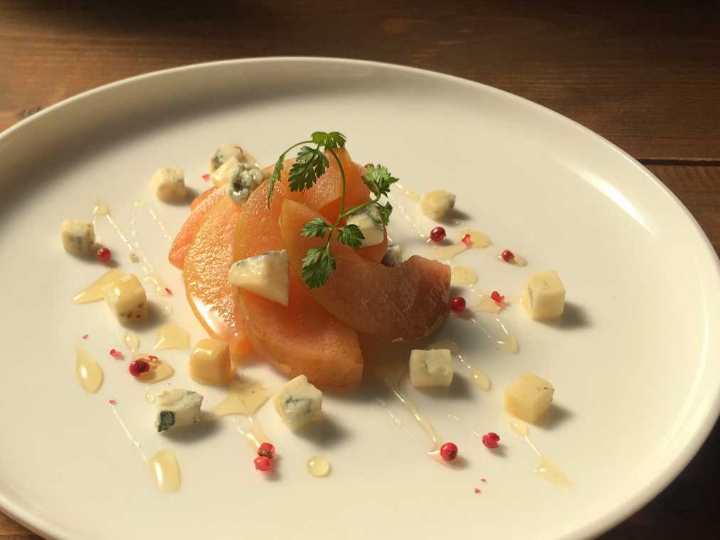 燻すことでまろやかな甘みに変化する蜂蜜はブルーチーズと相性抜群。燻製の香ばしい香りとはちみつの甘味がチーズのクセをやわらげるため、チーズが苦手な方にも好評だというのが「燻製りんごとブルーチーズ(燻製蜂蜜かけ)」(550円)。燻製りんごは香ばしさとジューシーさが新感覚!思わずペロリと食べてしまいます。