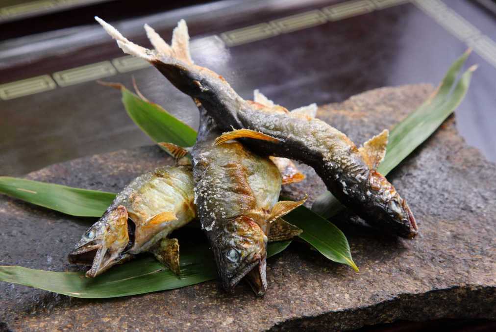 アユは塩焼きにしていただきます。身はホクホクで塩加減も絶妙!器には石を使用。料理の個性を際立たせる見せ方にも注目です。