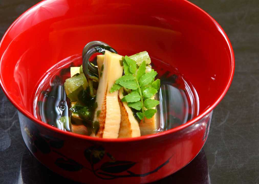 椀ものはしんじょにタケノコとフキ、山菜を添えてワカメのあんを掛けています。旬の食材を生かし、春から夏、秋へと向かっていく季節の移り変わりを舌でも味わえます。