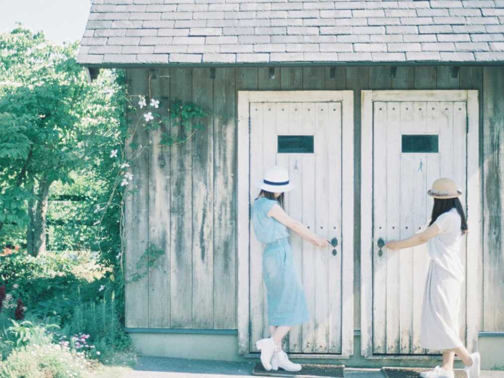 BBQができたり、ピザが焼けたり、牧場があったりと、一日ゆっくり楽しめます。実はこの写真の場所、お手洗いなんです。白い扉がかわいくて思わず撮りました。