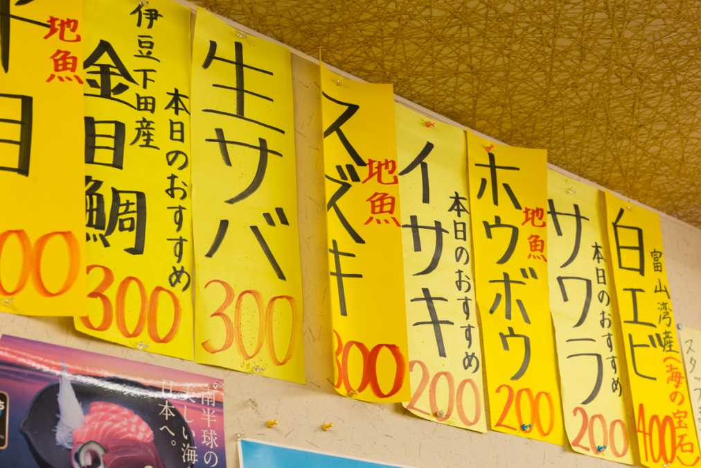 「市場寿し」店内に黄色の短冊で貼りだされているのが、その日おすすめのネタ。特に「地魚」と記載があるものは、那珂湊漁港で揚がった魚なので鮮度は抜群!