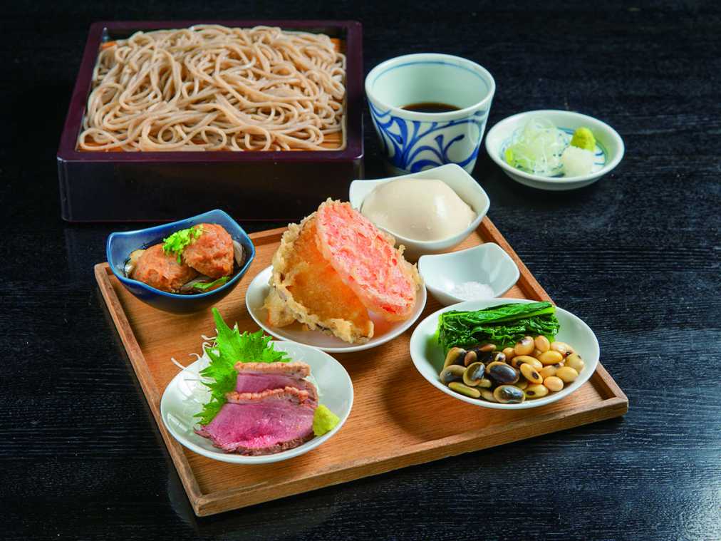 毎日手打ちする自家製粉の粗挽きそばは、香り豊かでのど越しも抜群です。季節野菜の天ぷらや合鴨ロースのたたきなど、前菜5品の盛り合わせが付く信州季節の五彩盛りと蕎麦のセット2484円は、お腹も大満足の人気メニュー。