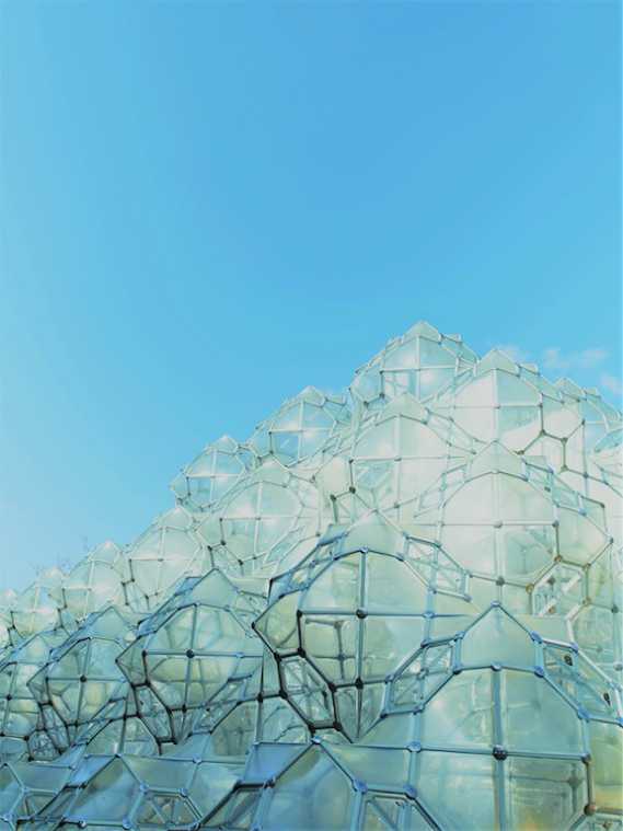 直径1.42mのカプセルが94個連なって構成された「しゃぼん玉のお城」。自然界が生み出す光の美をデザインに応用した作品で、このカプセルの積み方はダイヤモンドの結晶構造を拡大したものなんだそうです。